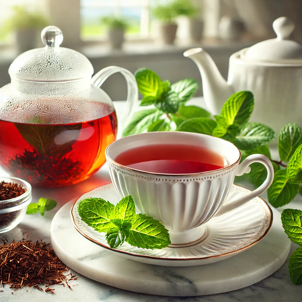 효과: 루이보스는 면역력을 높이는 데 탁월하며, 민트는 소화를 돕고 스트레스를 완화시켜줘요. 둘의 조합은 몸을 가볍고 상쾌하게 만들어 줍니다.